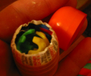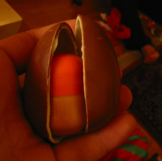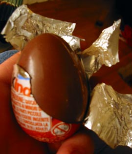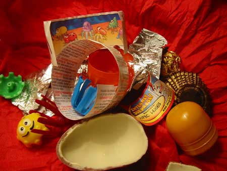 Like the cadbury egg in a United States easter, these ones are at christmas, and each have a different piece of plastic garbage in the center.
