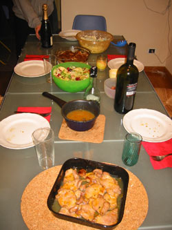 When I say "we" I'm excluding me - We made crab stuffed mushrooms, pork chops in a marmelade sauce, (fresh) bowtie pasta in a white sauce, Artichoke casserole, and Salad w/ sliced apple & roasted almonds. Awesome. Italians eat salad at the end of a meal, so did we. Keep in mind that all this ingredients was from the local market where even the pig was slaughtered just minutes prior to it's frying.