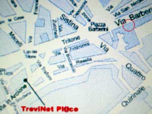 the red circle indicate where I am. They had a section where people with laptops & ethernet connections can get on their network for 5 euro an hour. I realized I didn't have the proper drivers installed for my network card, so I had to look up another, more accesible internet cafe in order to download the drivers, burn them to CD and then install them. I found TreviNet Place on the internet, took a photo of the map...